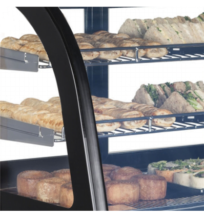 Denne kølemontre med buet glasfront byder på høj kvalitet i rustfrit stål og dobbeltglas. Den kompakte størrelse gør den ideel til at stille på disken, hvor den kan friste kunderne med et udvalg af udsøgt bagværk. På bagsiden har udstillingsmontren skydedøre i glas, som giver let adgang til indholdet. Bordmodellen kommer med faste trådhylder og LED belysning for optimal produktpræsentation.