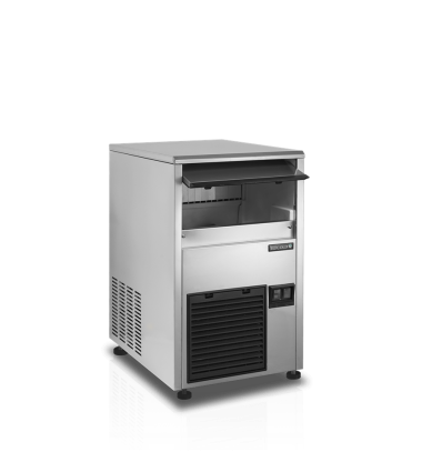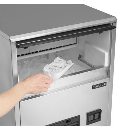 TC isterningmaskiner producerer solide, krystalklare isterninger vha. Tefcold spray system. Isterningerne smelter meget langsomt. Denne isterningmaskine er derfor oplagt til brug på caféer, restauranter, barer og andre steder, hvor der er brug for is til drikkevarer eller til at holde madvarer kolde, såsom frisk fisk. Isterningmaskinen har et stilrent ydre i SS304 rustfrit stål. På forsiden af maskinen finder du en skummet dør, der giver let adgang til opbevaringsplads. Dette rum er udstyret med Ag+ antibakteriel teknologi, der hjælper med forebyggelse af bakterier og dårlig lugt. For at sikre optimal drift er det gjort nemt at afmontere luftfilteret og rengøre det. TC isterningmaskinen benytter sig af luftkøling, hvilket betyder, at den tager luft ind fra omgivelserne og bruger denne til at køle systemet ned. Kapaciteten af isterningmaskinen påvirkes derfor af omgivelsernes temperatur såvel som af temperaturen på vandet, den indtager for at lave isterninger.